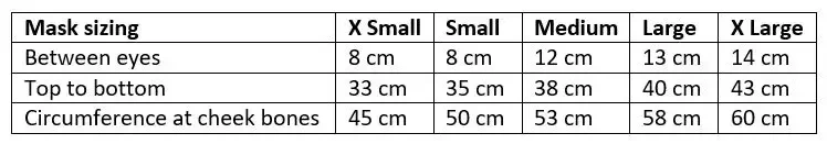 Aby wybrać odpowiedni rozmiar maski, należy zmierzyć szerokość materiału między oczami (tak, aby materiał nie dotykał oczu), obwód w dolnej części kości policzkowej oraz długość od potylicy do środka twarzy. Wymiary odpowiednie do danego rozmiaru podane są w tabeli zamieszczonej w galerii zdjęć. Uwaga! Wymiary są przybliżone, ponieważ każda maska jest ręcznie robiona w USA.