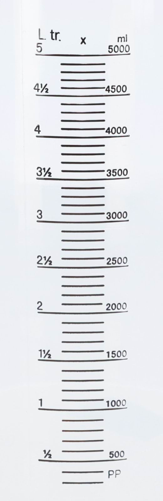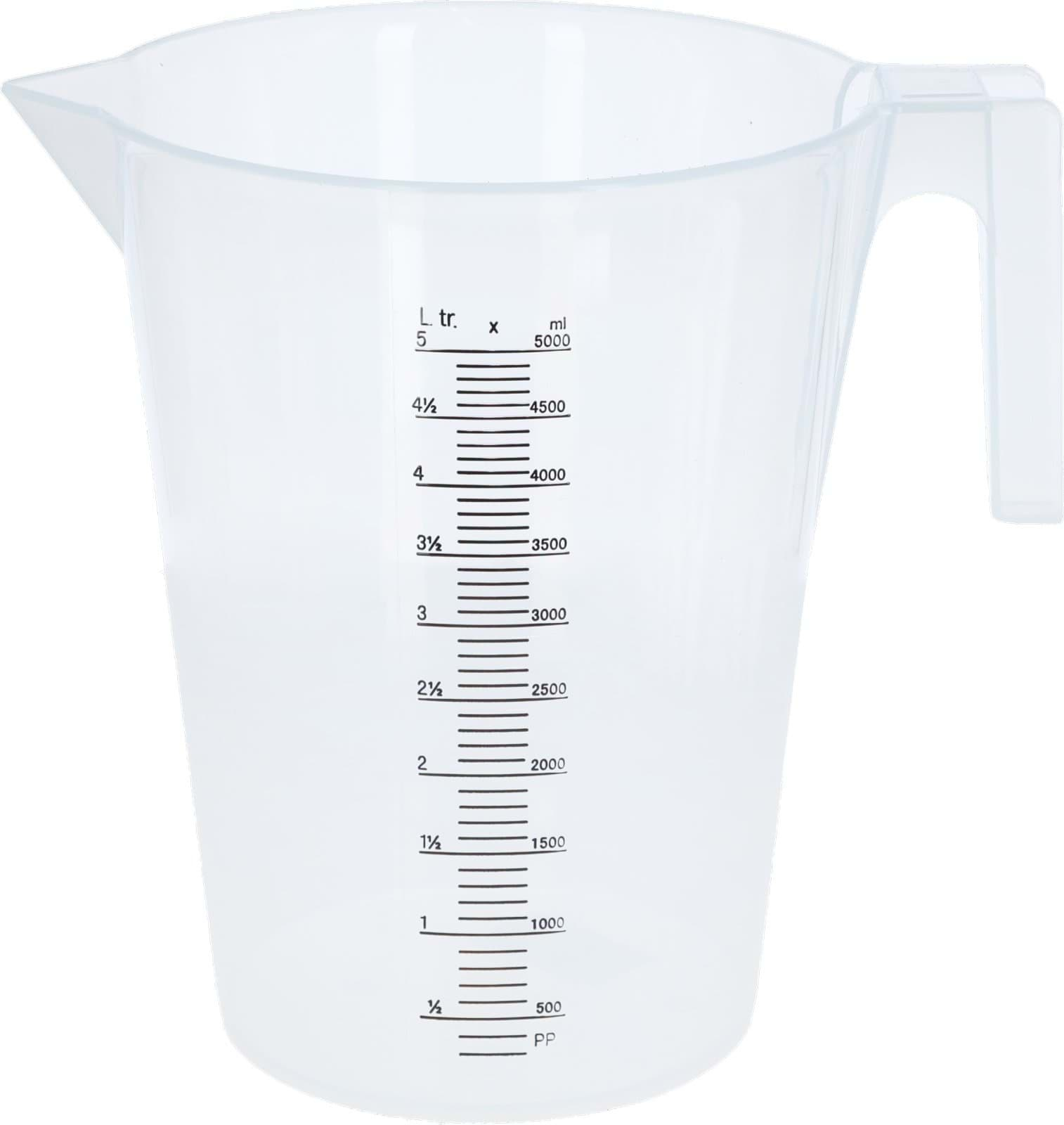 - Miarka plastikowa o pojemności 5 litrów, wykonana z trwałego, odpornego na uszkodzenia polipropylenu.