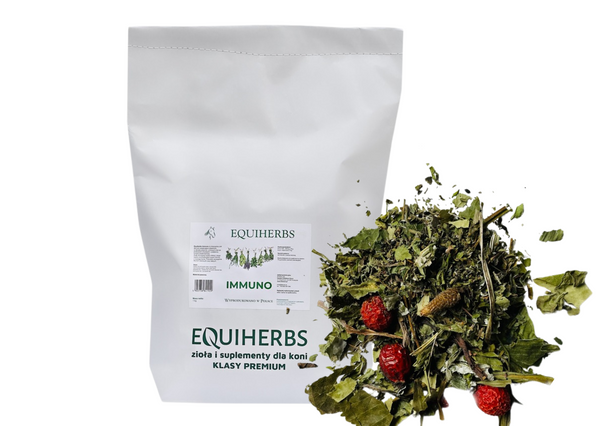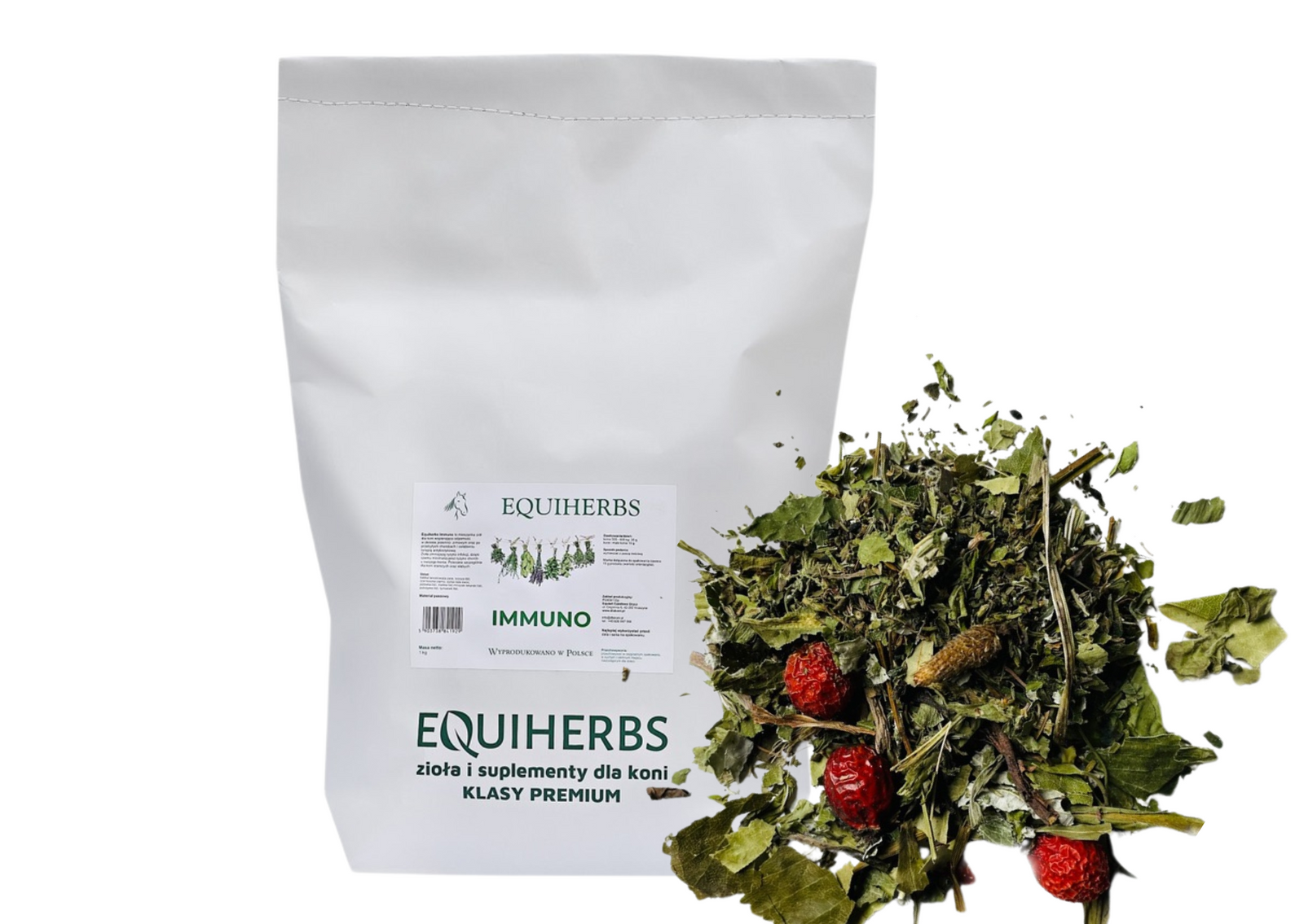 W składzie Immuno znajdują się między innymi liście jeżówki (Echinacea), jednej z najlepiej poznanych roślin stymulujących odpowiedź immunologiczną organizmu – przyspiesza ona aktywację leukocytów i zwiększa produkcję przeciwciał. Czarnuszka siewna działa wzmacniająco i antyoksydacyjnie, wspierając walkę z patogenami oraz proces regeneracji tkanek. Pokrzywa, mniszek lekarski, liść maliny i brzoza pełnią funkcje detoksykujące, oczyszczające i mineralizujące – wzbogacają dietę konia w mikro- i makroelementy. Dzika róża to doskonałe naturalne źródło witaminy C, wspierającej funkcjonowanie układu odpornościowego i przyspieszającej regenerację organizmu. Tymianek i babka lancetowata wspomagają drogi oddechowe oraz działają przeciwzapalnie.