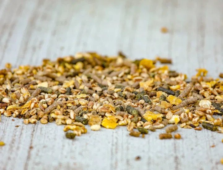 śruta pszenna, granulat z lucerny, płatki kukurydziane, owies, otręby pszenne, płatki jęczmienne, łuski lnu, siemię lniane, melasa buraczana, prażone ziarna soi, łuski orkiszu, łamane nasiona oleiste, olej sojowy, łuski soi, jęczmień dmuchany, kukurydza dmuchana, pszenica dmuchana, mączka rzepakowa, pszenica, orkisz, suszona pulpa z cykorii, mączka z nasion słonecznika, fruktooligosacharydy, węglan wapnia, chlorek sodu, uwodniony krzemian magnezu.