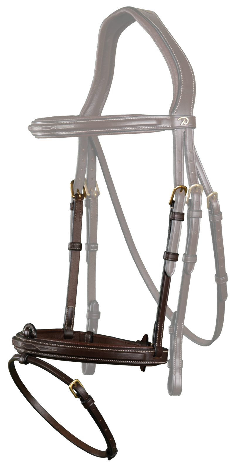 - Klasyczny nachrapnik angielski ozdobiony kontrastowymi przeszyciami.