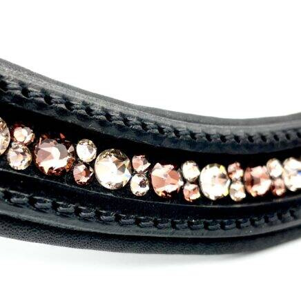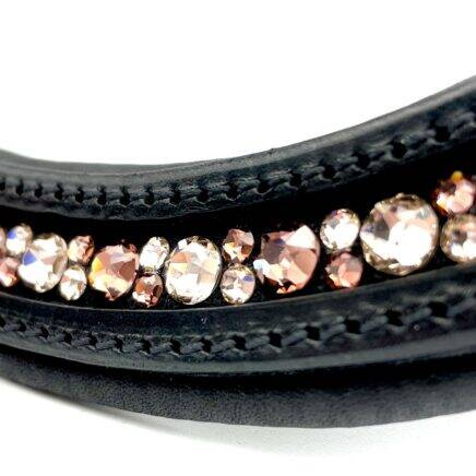 Ręcznie wykonany naczółek ozdobiony kryształkami w dwóch odcieniach eleganckiego różu, których urok i delikatność pasuje do każdego odcienia sierści konia.