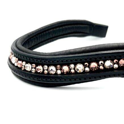 Ręcznie wykonany naczółek ozdobiony kryształkami w dwóch odcieniach eleganckiego różu, których urok i delikatność pasuje do każdego odcienia sierści konia.