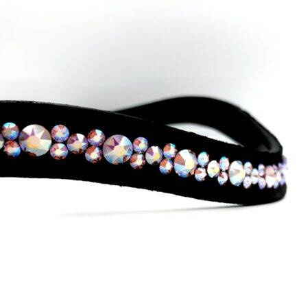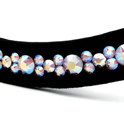 - Ręcznie wykonany naczółek ozdobiony kryształkami mieniącymi się zarówno w świetle dziennym, jak i sztucznym w kolorach białym oraz różowym, z lekką poświatą niebieskiego.