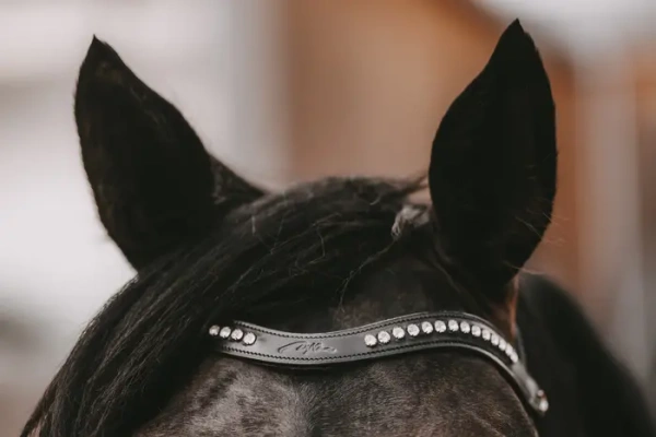 - Naczółek opadający, ozdobiony białymi kamieniami Swarovski. Na środku ma wytłoczone logo marki.