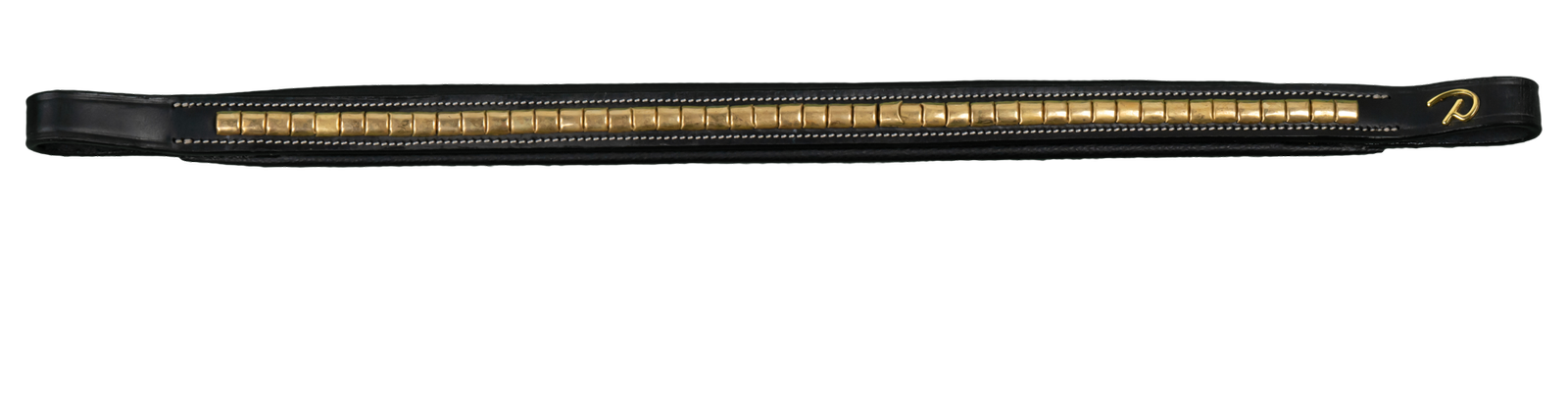 - Prosty naczółek ze złotymi, kwadratowymi kamieniami i kremowymi szwami.