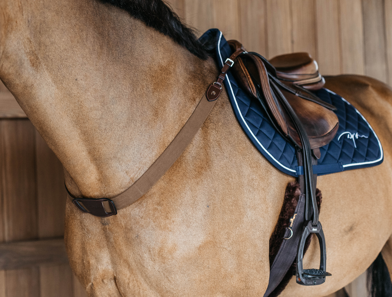 Napierśnik jest łatwy do zakładania i regulacji – można go dopasować przy siodle, co umożliwia szybkie dostosowanie do indywidualnych potrzeb.