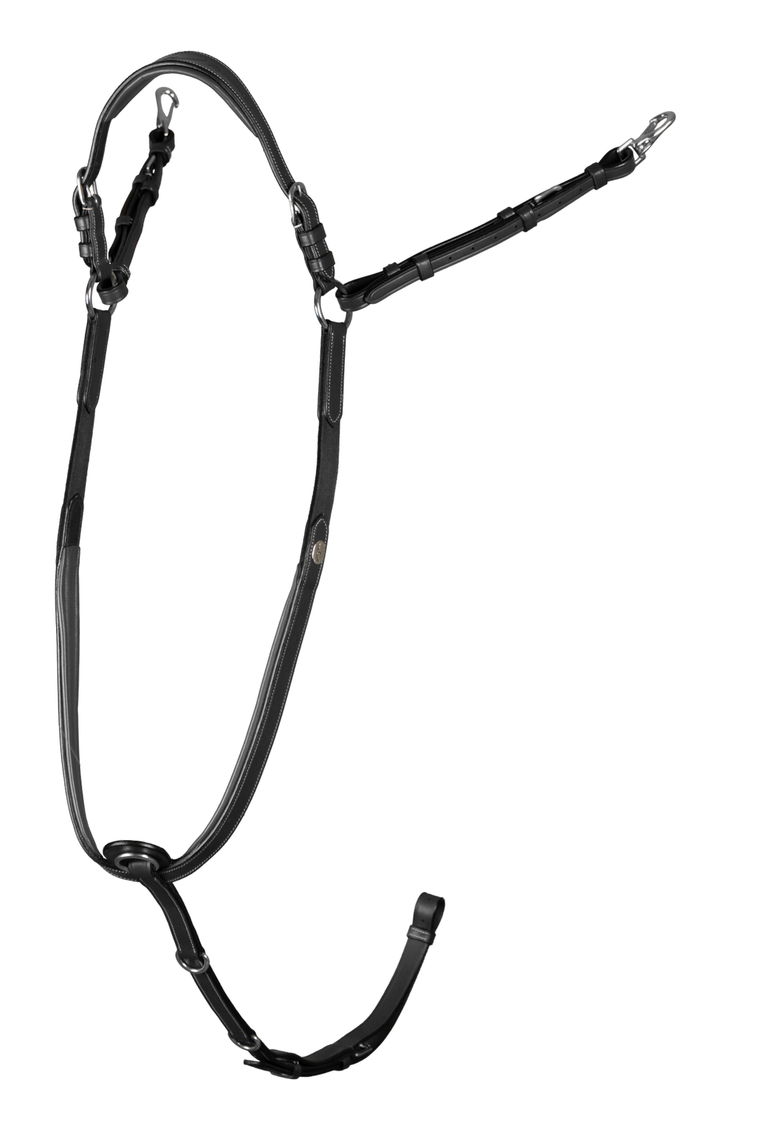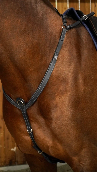 - Klasyczny napierśnik z mostkiem. Po bokach ma elastyczne wstawki o długości 6 cm, które zapewniają dopasowanie do konia.