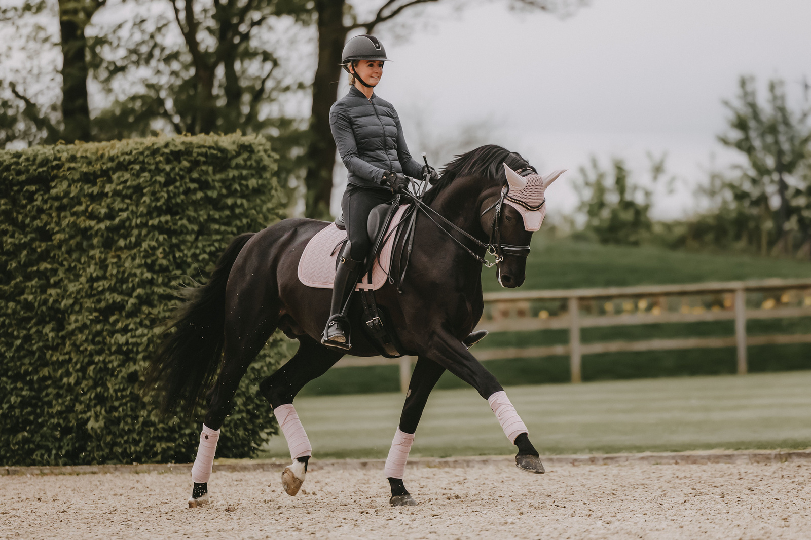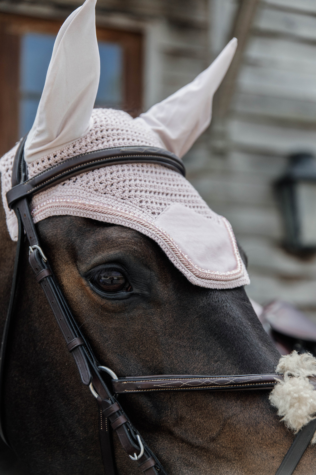 Nauszniki łączą skuteczną ochronę uszu konia z wyjątkowo eleganckim wykończeniem. Welurowe detale zestawione z subtelnymi perełkami nadają im elegancki wygląd, który świetnie prezentuje się zarówno na zawodach, jak i podczas treningów. Jednocześnie model ten spełnia swoją podstawową funkcję – chroni uszy konia przed muchami i innymi owadami, co pomaga ograniczyć rozdrażnienie, potrząsanie głową i napięcie w obrębie szyi.
