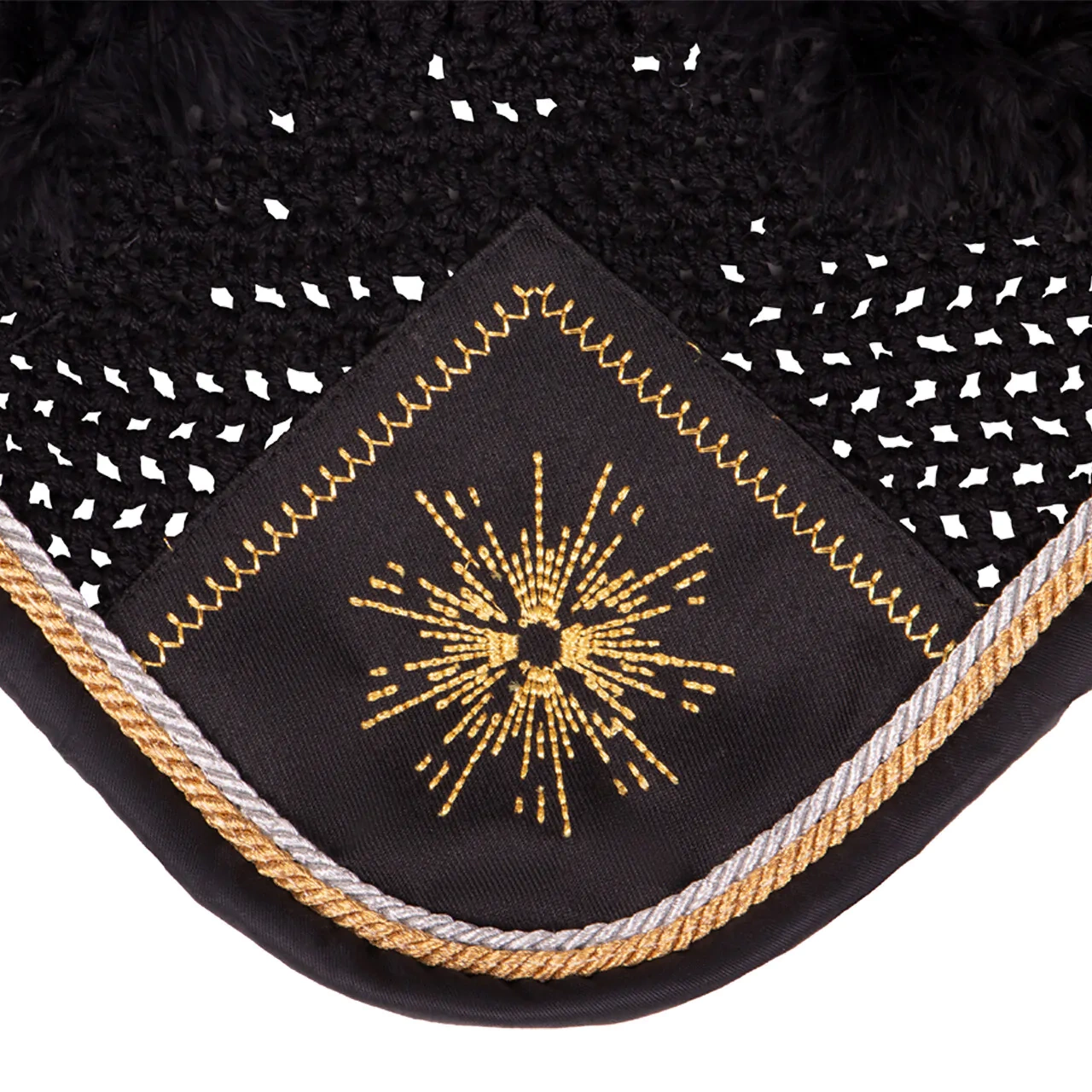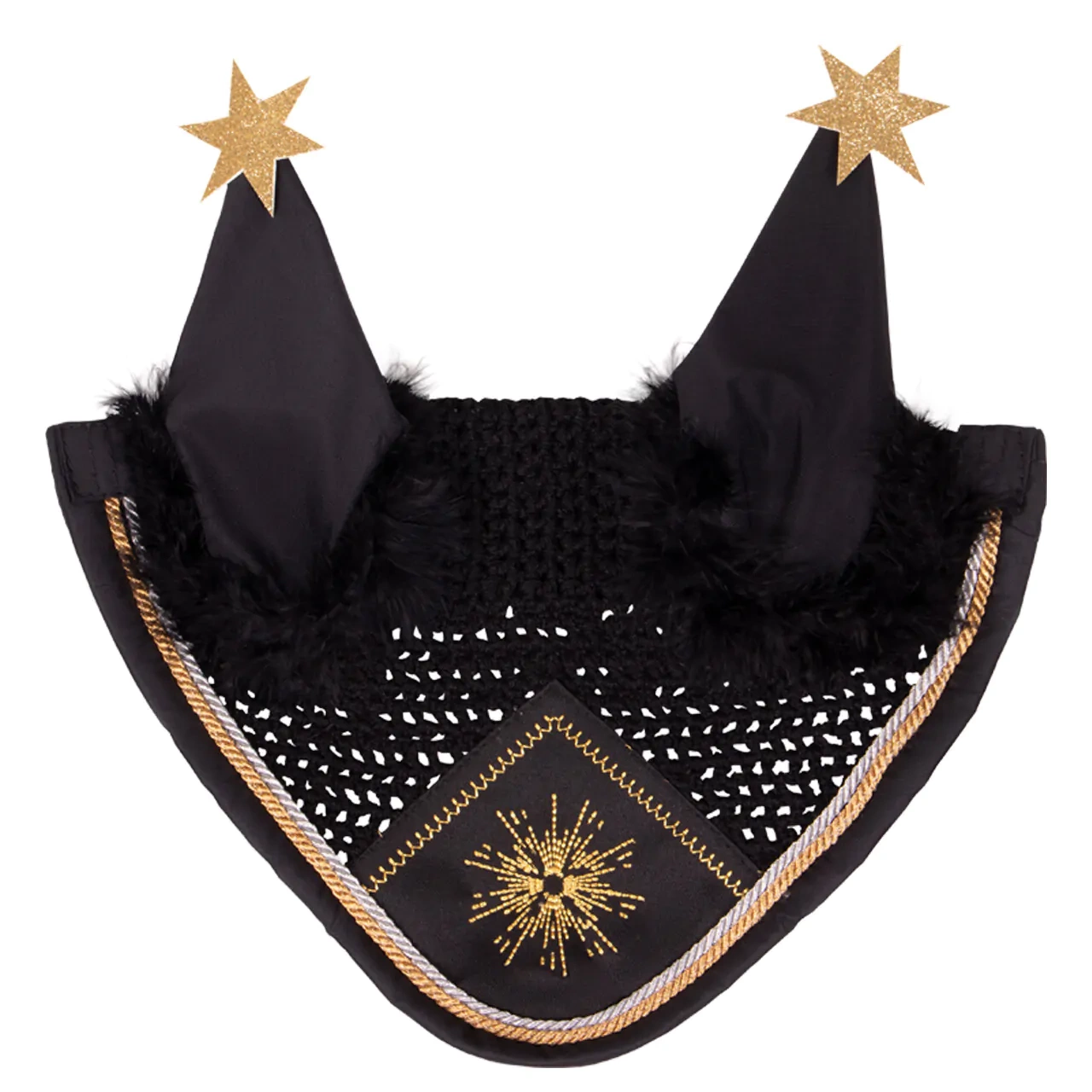 - Urocze nauszniki w złote detale i czarne piórkowe wykończenie na początku uszu.