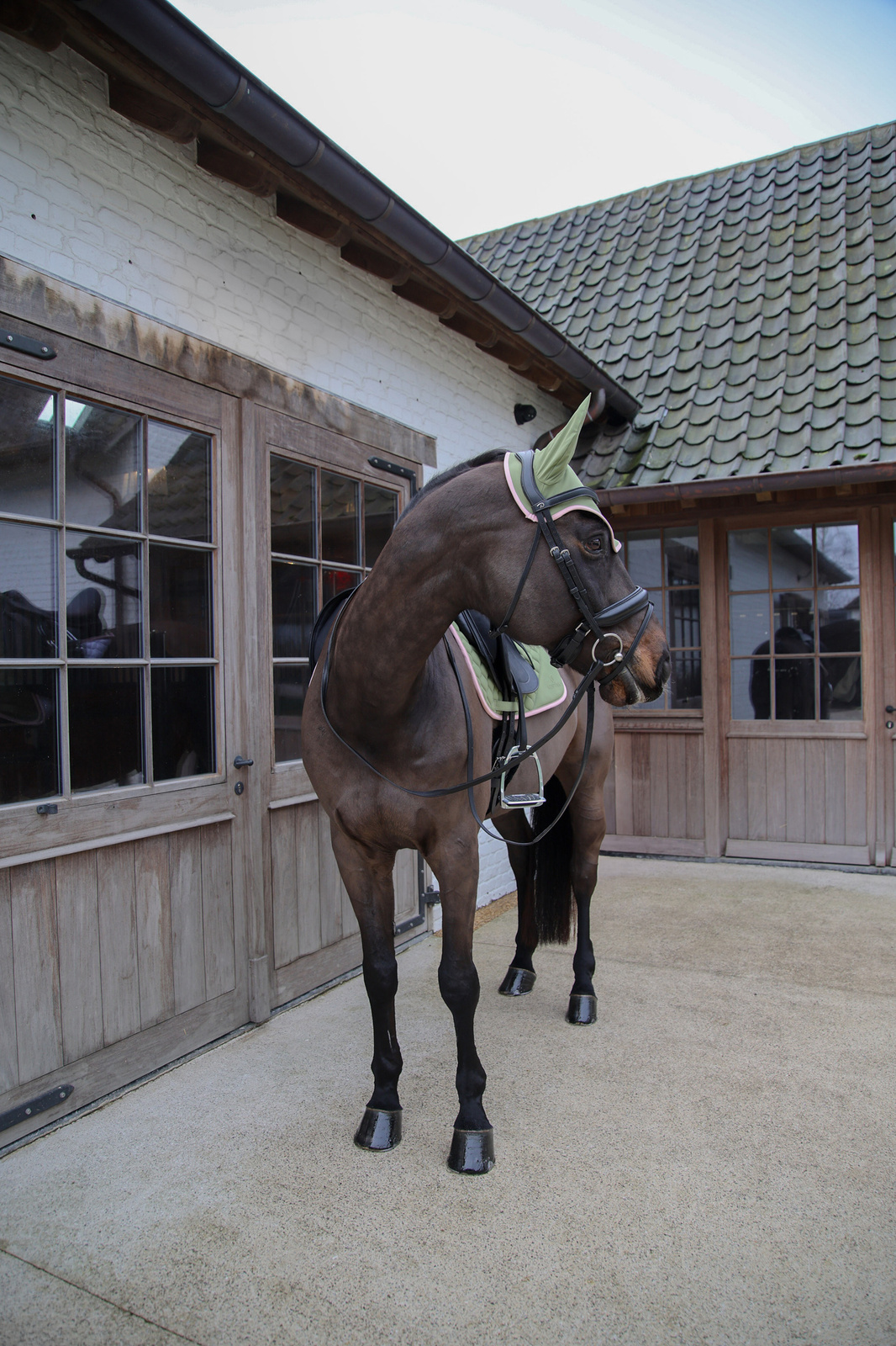 Materiał wokół uszu jest elastyczny i ma smukły krój, dzięki czemu dokładnie przylega, nie uciska i nie ogranicza naturalnego ruchu uszu. To ważne zwłaszcza u koni wrażliwych, które źle reagują na sztywne lub zbyt grube materiały.