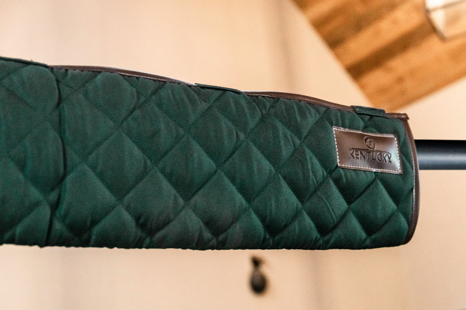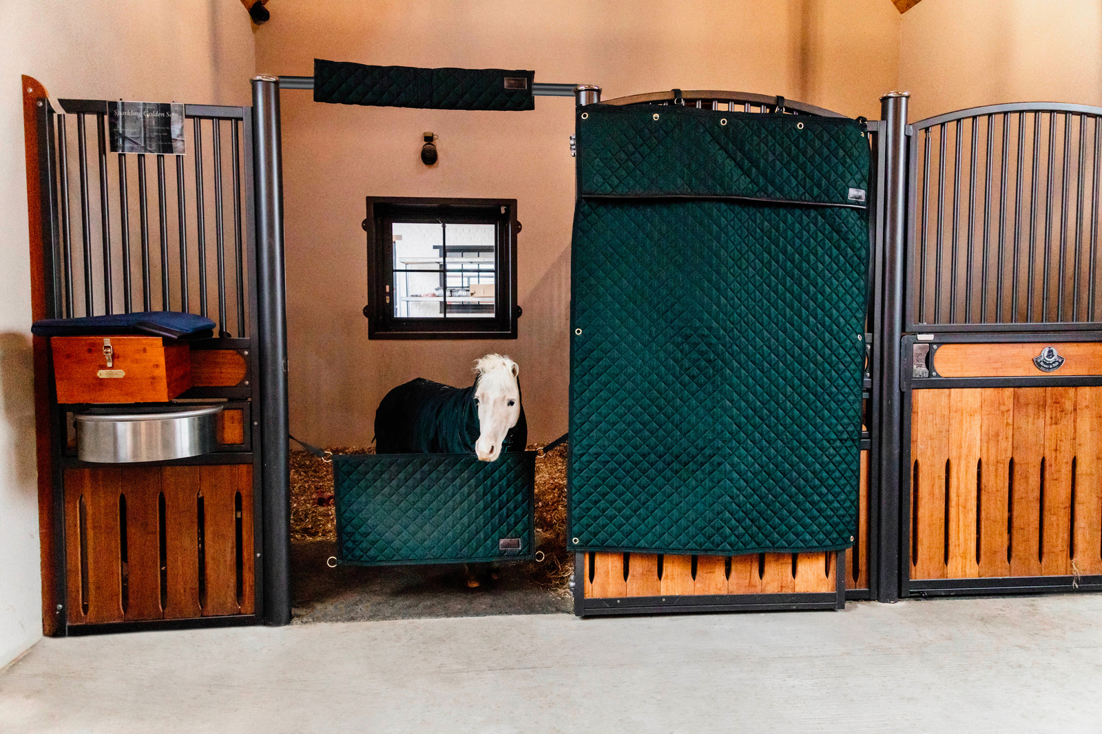 Ochraniacz wykonany jest z niezwykle trwałego, odpornego na uszkodzenia materiału 600D high tenacity polyester, który doskonale znosi codzienne użytkowanie w stajennych warunkach. Luksusowy wygląd panelu uzyskano dzięki pikowaniu w charakterystyczny wzór w romby oraz eleganckim wykończeniom ze sztucznej, brązowej skóry — dokładnie w tym samym stylu, który wyróżnia wszystkie akcesoria stajenne Kentucky. Dzięki temu Head Protector świetnie komponuje się z zasłonami boksowymi Stable Curtain i bramkami Stable Guard, tworząc razem spójny i elegancki zestaw, idealny zarówno do prywatnych stajni, jak i na wyjazdy konkursowe.