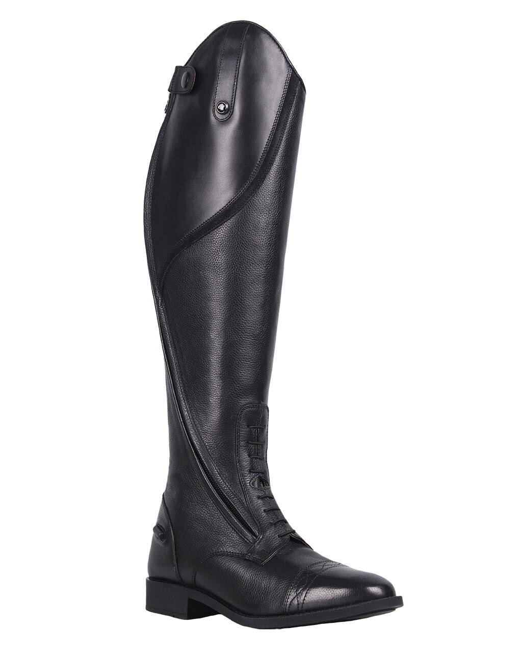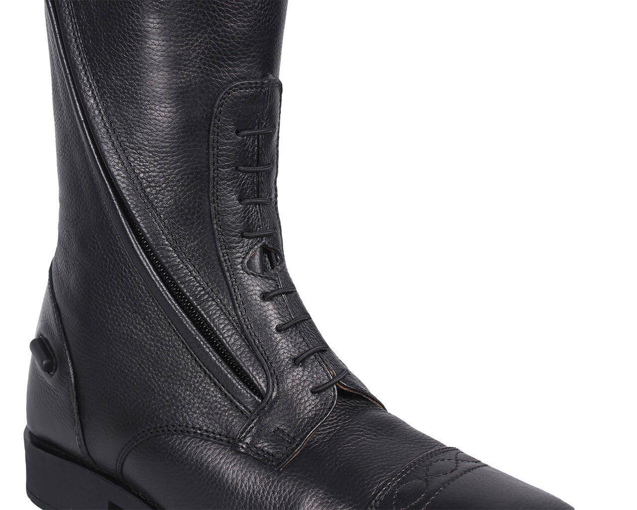 Z przodu mają elastyczne sznurowadła oraz ukośny zamek.