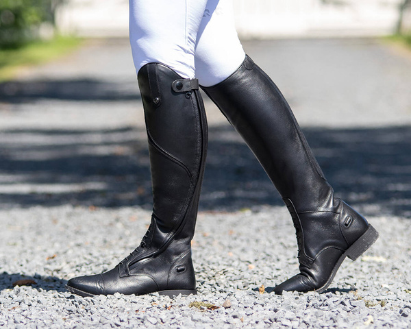Z przodu mają elastyczne sznurowadła oraz ukośny zamek.