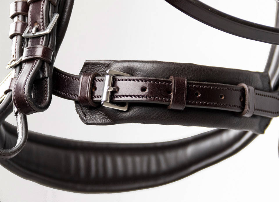 Anatomiczne ogłowie ujeżdżeniowe, z podwójnymi paskami policzkowymi.