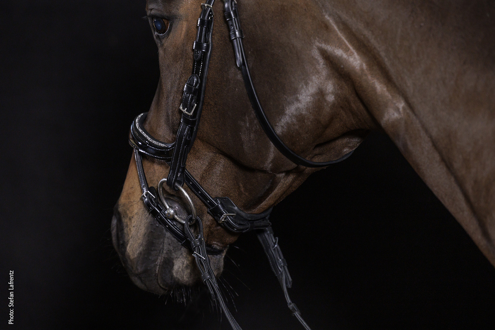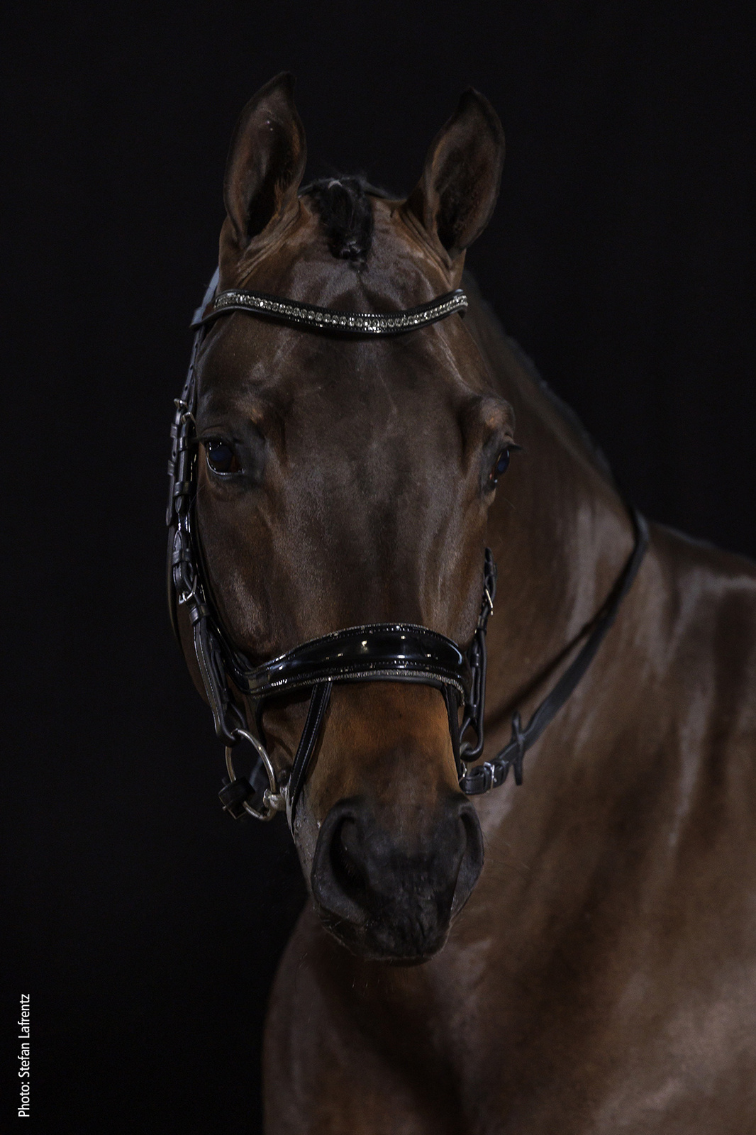 Już na pierwszy rzut oka ogłowie przyciąga uwagę dzięki zakrzywionemu naczółkowi z lakierowanej skóry z dużymi kryształami.