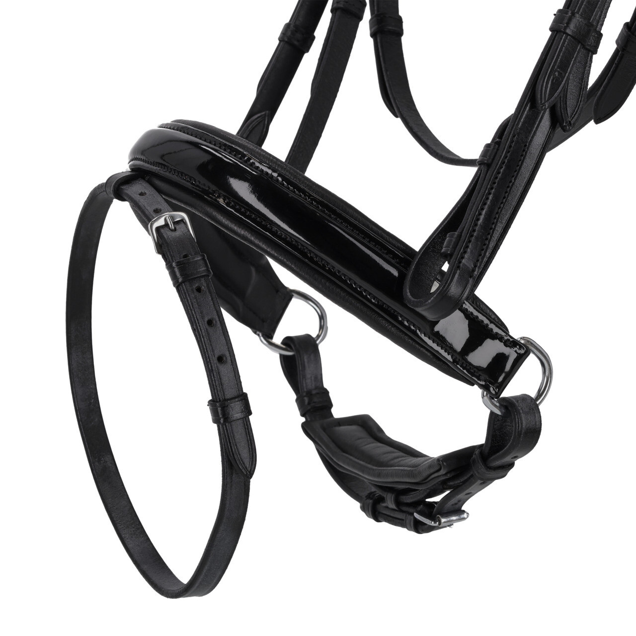 Wykonane z wysokiej jakości skóry, wyróżnia się eleganckim nachrapnikiem z lakierowanej skóry oraz anatomicznie profilowaną, wyjątkowo szeroką potylicą, która została zaprojektowany tak, by redukować nacisk na wrażliwe miejsca.