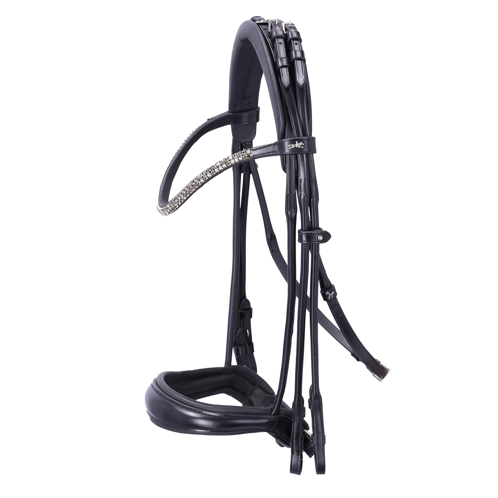 Elegancki, smukły naczółek ozdobiony dwiema liniami kwadratowych kryształów nadaje całości subtelnie luksusowy charakter, idealnie wpisujący się w estetykę ujeżdżenia.