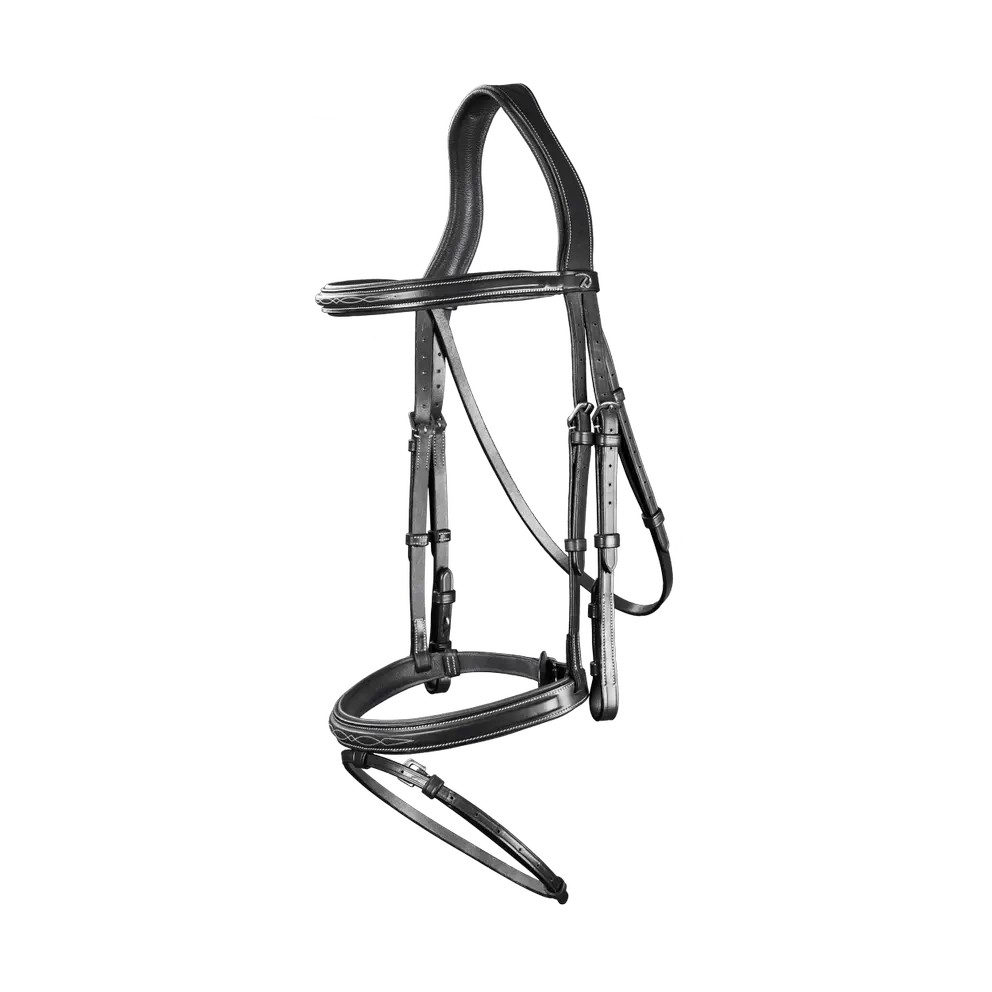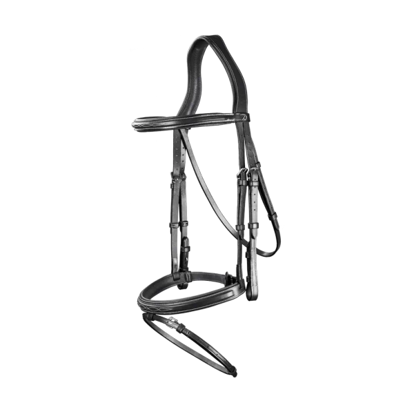 • Ogłowie z nachrapnikiem angielskim, kombinowanym z całkowicie zdejmowanym paskiem krzyżowym.