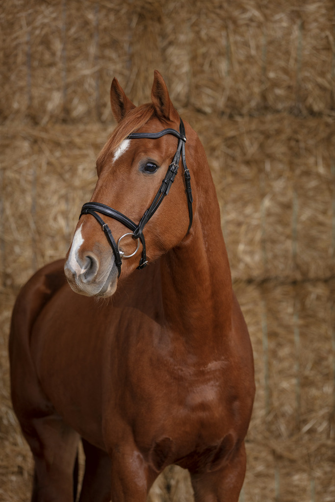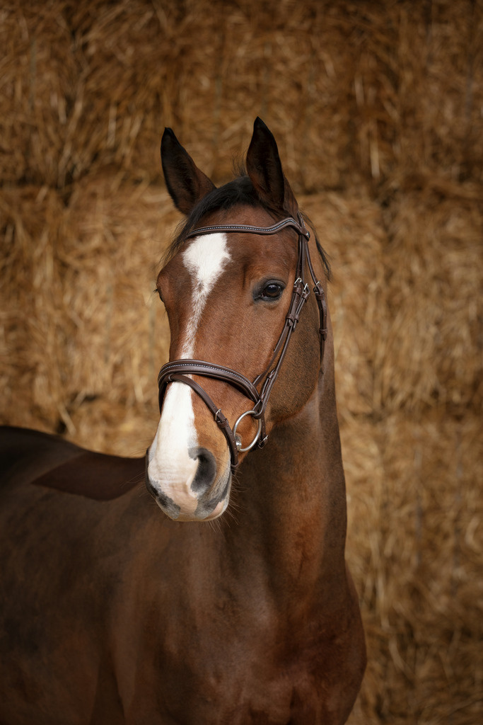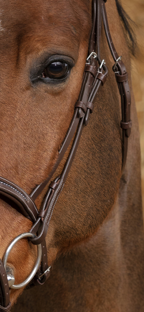 • Ekskluzywne ogłowie wykonane z wysokiej jakości skóry bawolej, wyróżniające się błyszczącymi kryształkami na nachrapniku i naczółku.