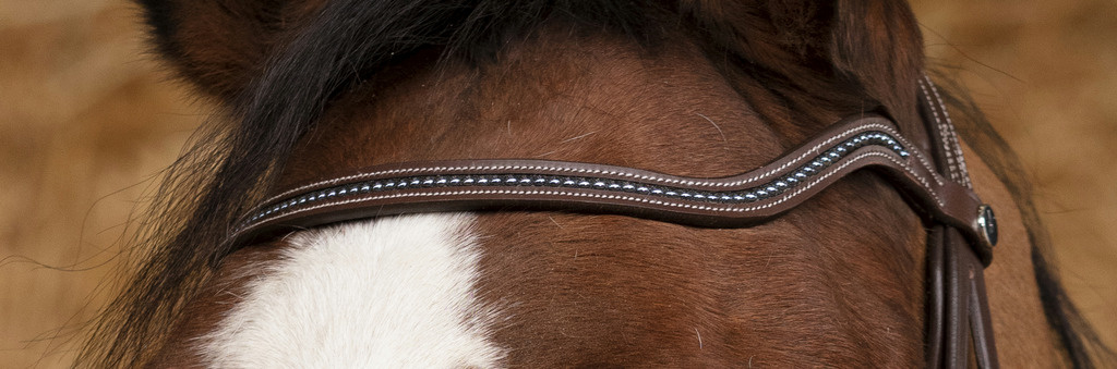 Ekskluzywne ogłowie wykonane z wysokiej jakości skóry bawolej, wyróżniające się błyszczącymi kryształkami na nachrapniku i naczółku.