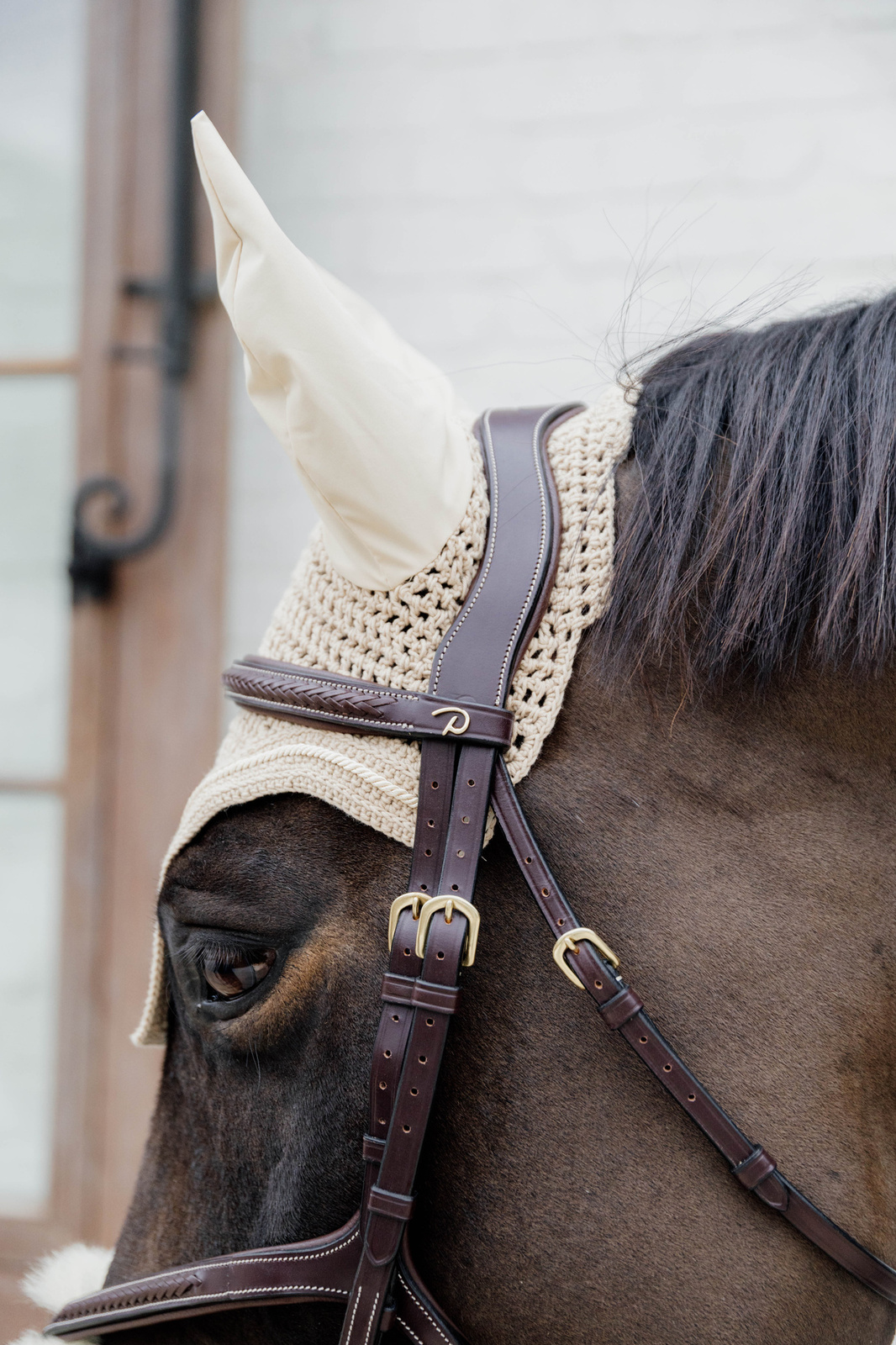 Charakterystycznym elementem tego ogłowia są plecione detale skórzane na nachrapniku oraz naczółku.