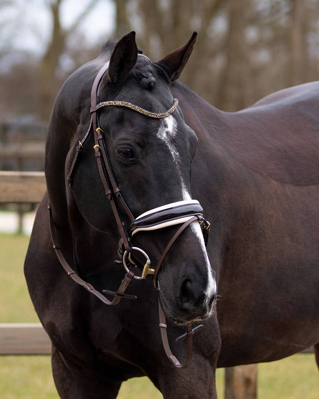 Ogłowie z lakierowanym nachrapnikiem szwedzkim, kombinowanym ze skośnikiem.