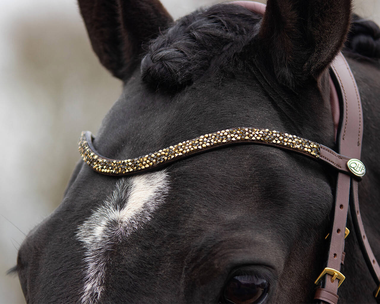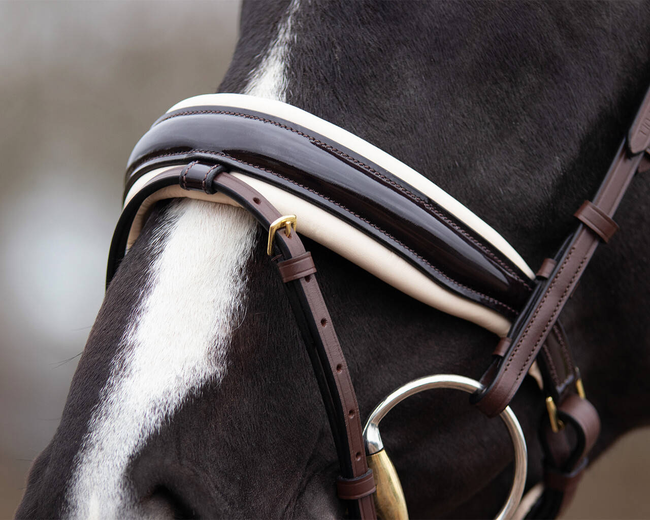 - Ogłowie z lakierowanym nachrapnikiem szwedzkim, kombinowanym ze skośnikiem.