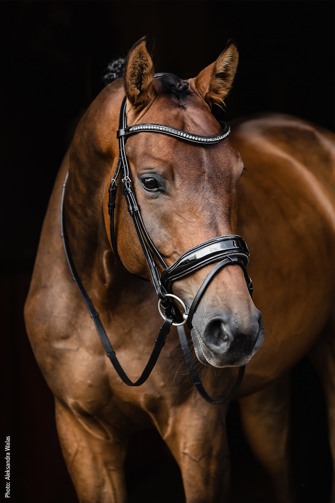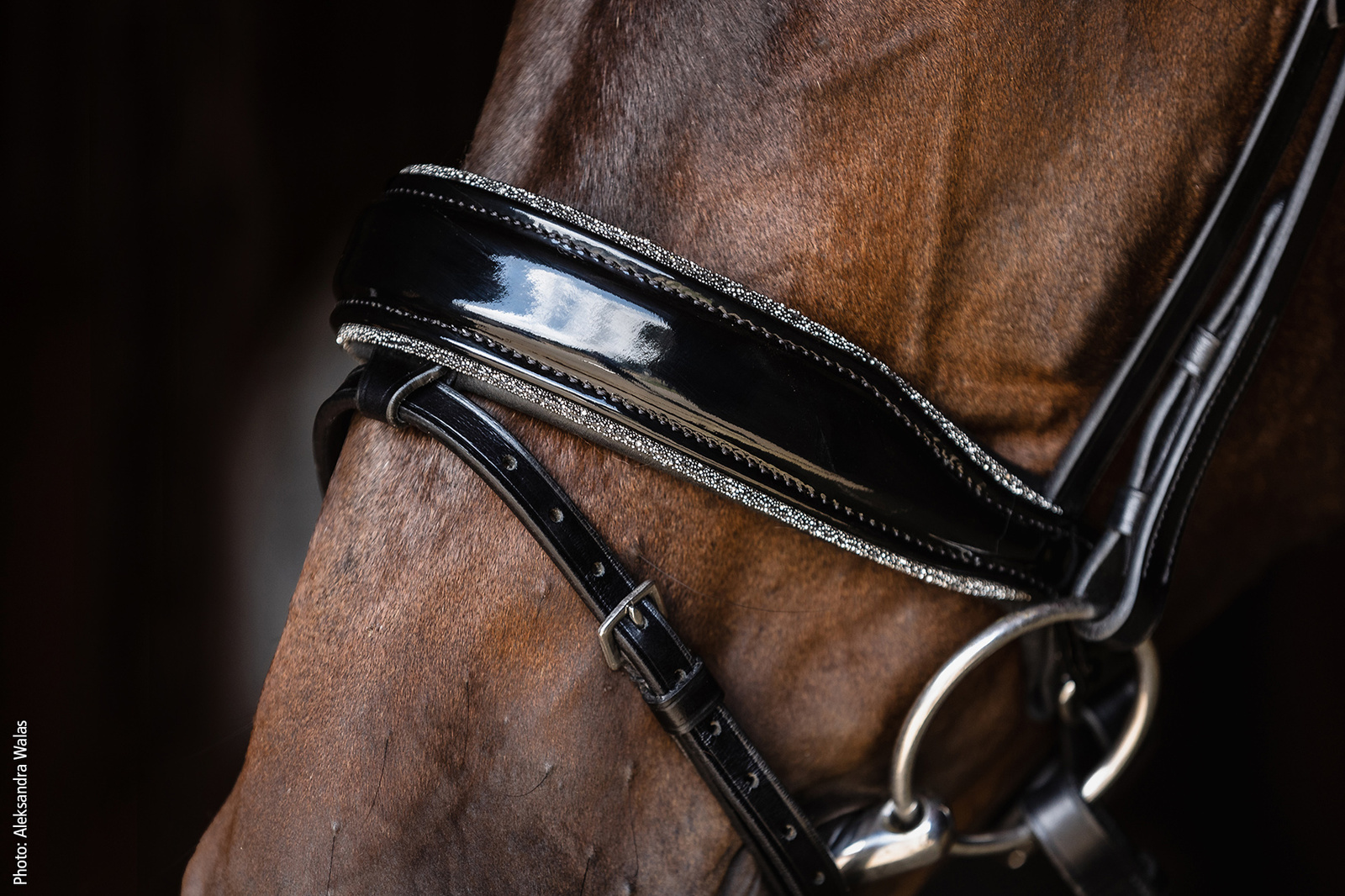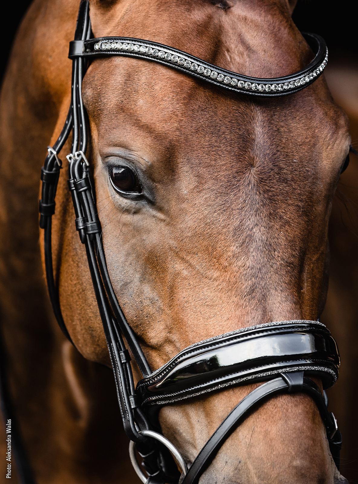 Wyraźnym znakiem rozpoznawczym wersji Glam jest lakierowany nachrapnik z brokatową lamówką, który przyciąga wzrok i podkreśla ekskluzywny charakter ogłowia. Całość dopełnia lakierowany naczółek ozdobiony dużymi kryształami, nadający ogłowiu elegancji i wyjątkowej prezencji na czworoboku konkursowym. To model stworzony dla jeźdźców, którzy chcą się wyróżnić, zachowując jednocześnie klasyczną linię i sportowy charakter sprzętu.
