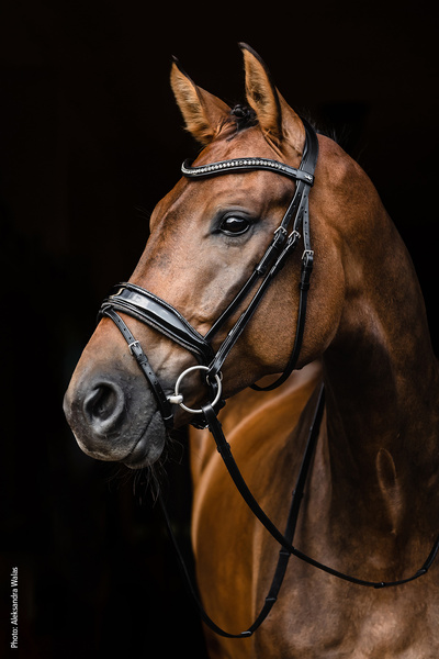 Model wyposażono w anatomicznie wyprofilowany nachrapnik zaciskowy (szwedzki), który idealnie dopasowuje się do anatomii głowy konia, zapewniając stabilne i równomierne ułożenie. Spłaszczone elementy boczne nadają ogłowiu czysty, uporządkowany wygląd oraz sprzyjają spokojnej pracy w kontakcie, co jest szczególnie istotne w ujeżdżeniu sportowym.