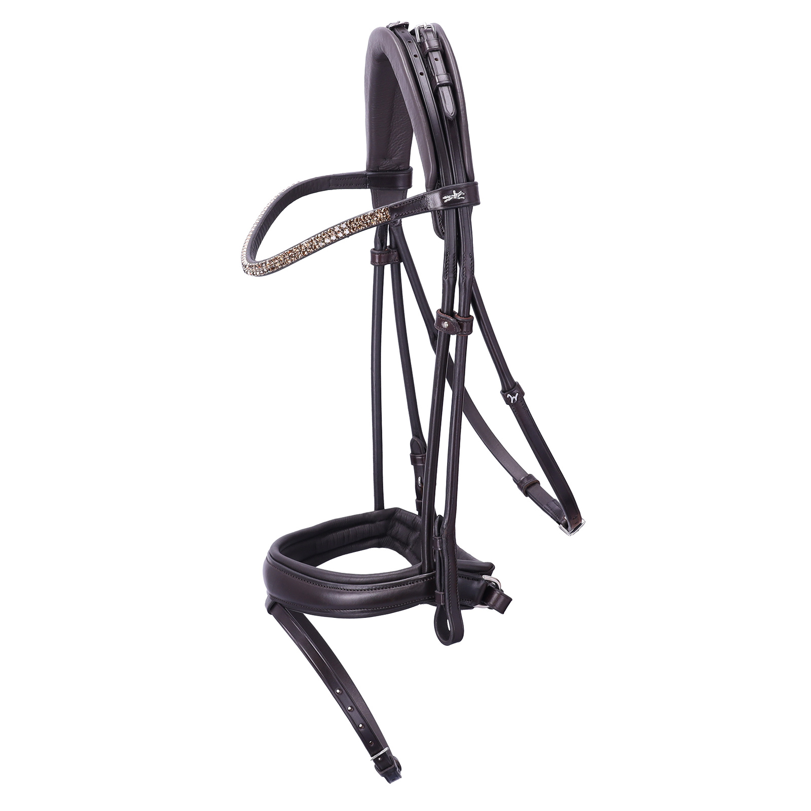 Elegancki, smukły naczółek ozdobiony dwiema liniami kwadratowych kryształów nadaje całości subtelnie luksusowy charakter, idealnie wpisujący się w estetykę ujeżdżenia.