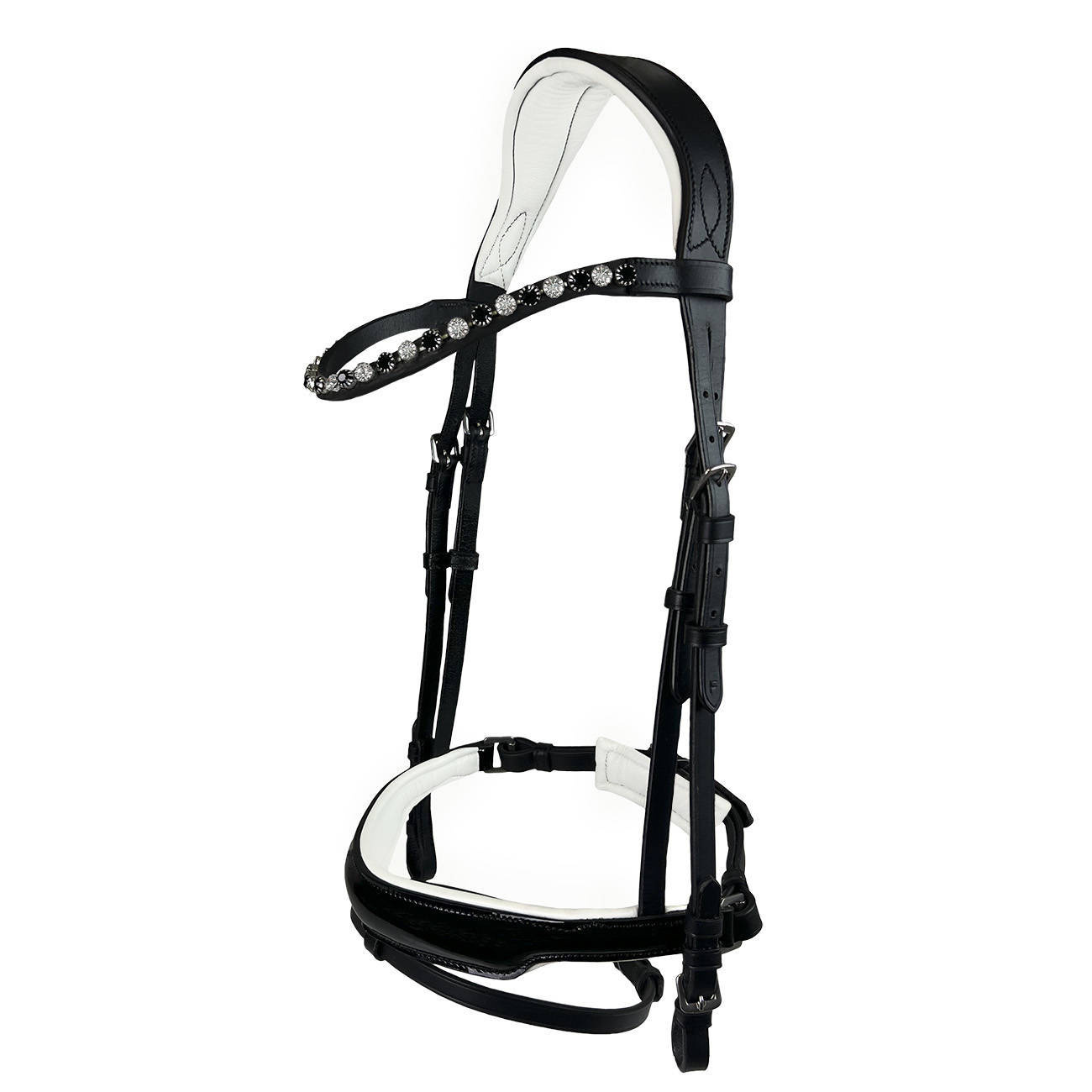 Opadający naczółek z dwukolorowymi kryształkami oraz lakierowana skóra na nachrapniku nadają niepowtarzalnego charakteru