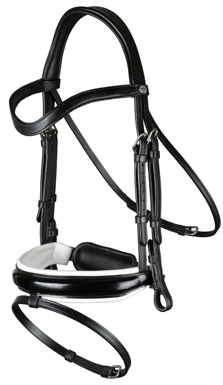 Posiada lakierowany, duży nachrapnik szwedzki. Z białym, miękkim podszyciem.