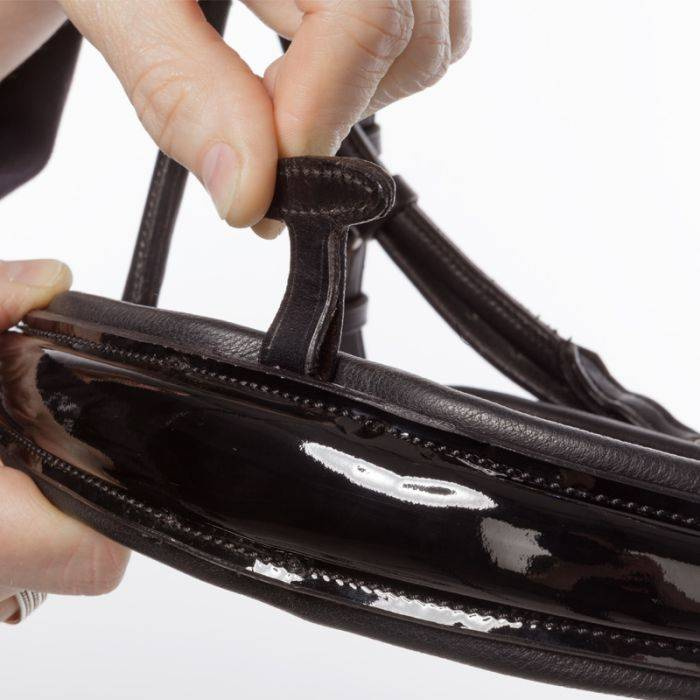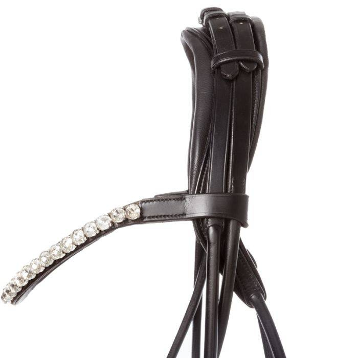 • Zachwyca swoją elegancją: zawijane paski policzkowe, zakrzywiony naczółek z dużymi białymi cyrkoniami i szeroki, lakierowany, nachrapnik.