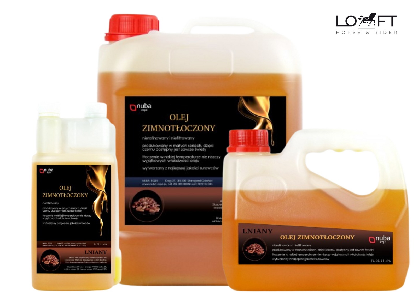 Suplementacja olejem lnianym sprawdza się zarówno u koni sportowych, które potrzebują dodatkowego źródła energii i wsparcia regeneracji, jak i u koni starszych czy nieotrzymujących trawy, u których poprawia wydolność organizmu, wspiera układ odpornościowy i łagodzi objawy alergii. Olej ten jest polecany również koniom z chorobą wrzodową żołądka, ponieważ łagodzi podrażnienia i regeneruje śluzówkę układu pokarmowego. Cenną cechą oleju lnianego jest jego działanie wspierające metabolizm – aktywizuje on przemianę materii i może przyczyniać się do redukcji tkanki tłuszczowej, co czyni go pomocnym w diecie koni otyłych. Regularne stosowanie poprawia stan skóry, jakość rogu kopytowego oraz nadaje sierści piękny, naturalny połysk.