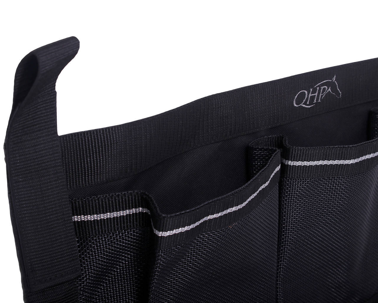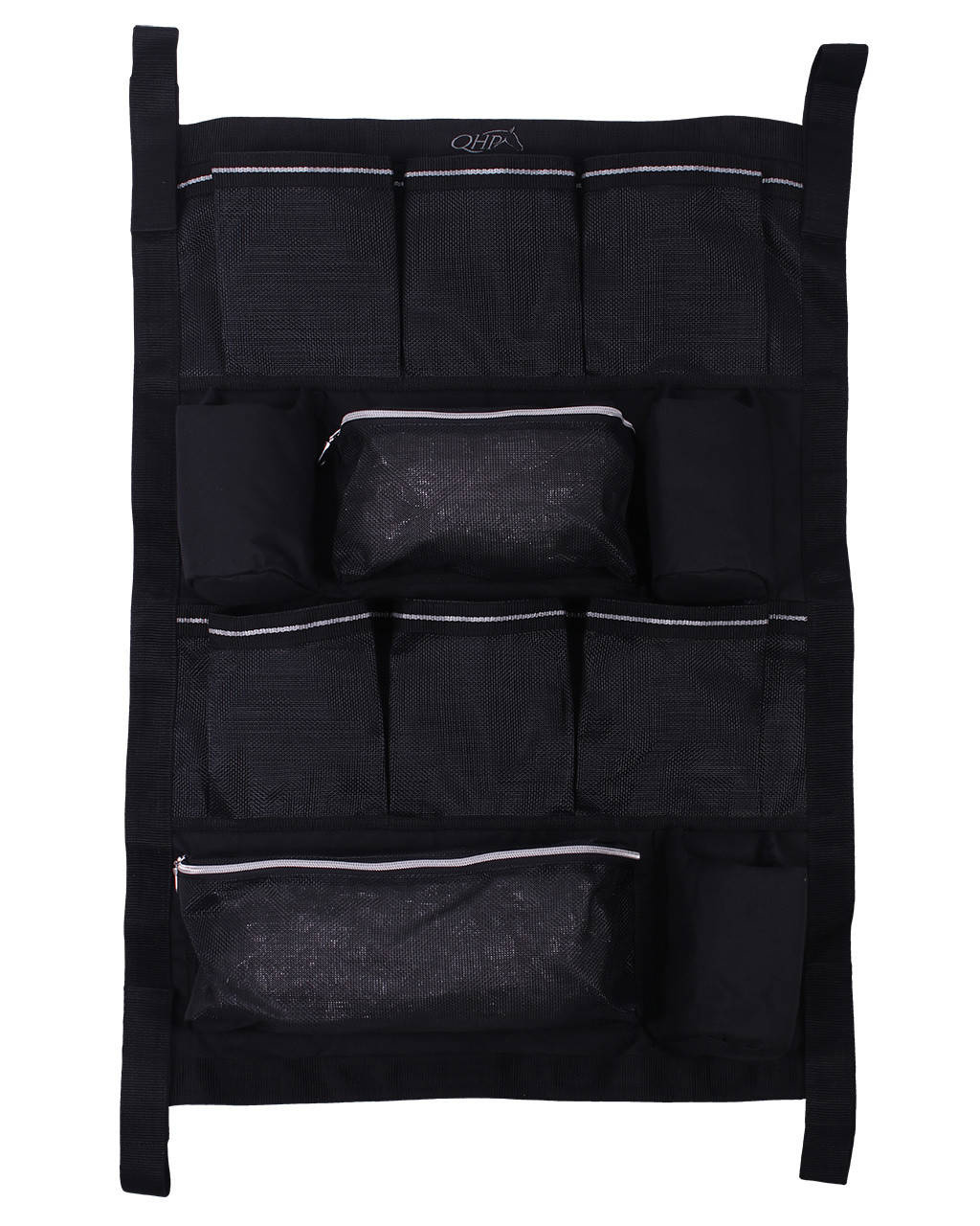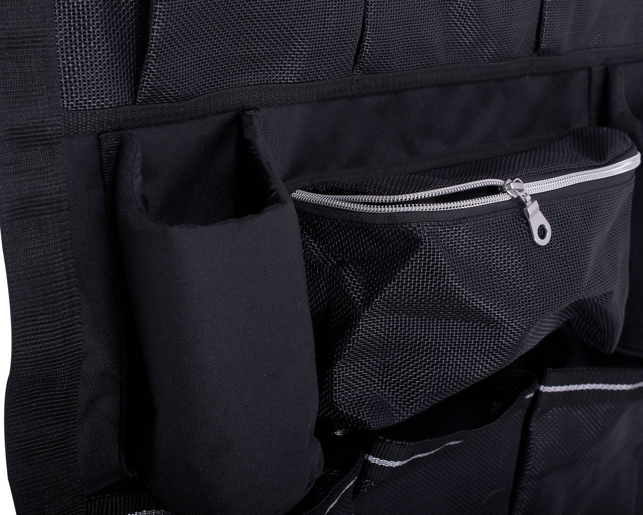 Wyposażony w sześć elastycznych kieszeni z siatki, dwie elastyczne kieszenie zapinane na suwak i trzy wzmocnione, okrągłe kieszenie.