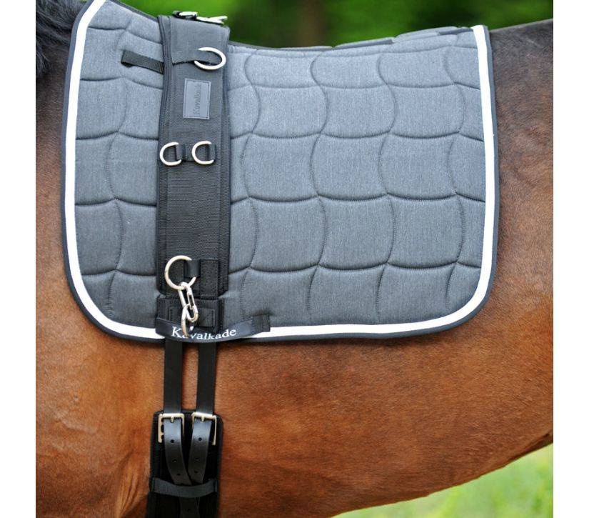 - Pas wykonany z wytrzymałego materiału z miękkim podszyciem i grubą wyściółką, która idealnie dopasowuje się do grzbietu konia.