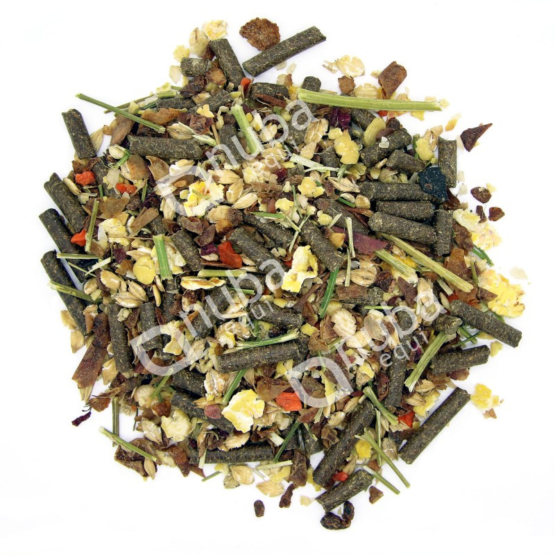 mączka z suszonej lucerny, soja płatkowana (mikronizowana termicznie) [GMO free], suszone wytłoki jabłkowe, jęczmień płatkowany (mikronizowany termicznie), makuch lniany, szarańczyn strąkowy, otręby pszenne, siemię lniane (extra), wysłodki buraczane (niemelasowane), drożdże paszowe, kukurydza płatkowana (mikronizowana termicznie), węglan wapnia, fosforan wapnia, tlenek magnezu, sieczka z suszonej lucerny, marchew suszona (extra-płatki), burak suszony (extra-płatki), olej lniany, chlorek sodu, aminokwasowy chelat cynku [E4], lizyna, octan tokoferylu (witamina E) [3a700], aminokwasowy chelat miedzi [E6], algi morskie, aminokwasowy chelat selenu [E8], beta-karoten (witamina A), probiotyk Biogen, cholekalcyferol (witamina D3) [E671]