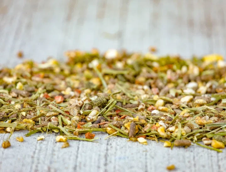 Skład: otręby pszenne, płatki jęczmienne, siemię lniane, śruta pszenna, kukurydza dmuchana, orkisz, pszenica dmuchana, mączka sojowa (produkowana z genetycznie modyfikowanej soi), melasa buraczana, siemię lniane, pellet z lucerny, łodygi lucerny, kawałki marchwi, prażone ziarna soi, śruta rzepakowa, łuski orkiszu, łamane nasiona oleiste, mączka z nasion słonecznika, węglan wapnia, olej sojowy, łuski sojowe, pszenica, chlorek sodu, fruktooligosacharydy, ocet winny, gluten kukurydziany, kukurydziany likier stromy, aromat czosnku
