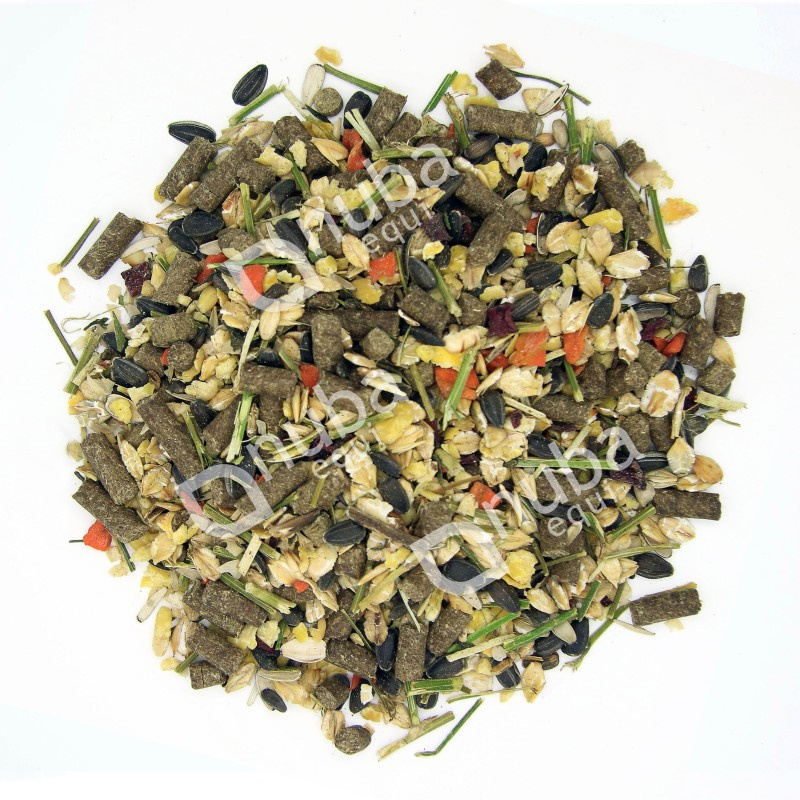 soja płatkowana (mikronizowana termicznie, bez GMO), jęczmień płatkowany (mikronizowany termicznie), otręby ryżowe z zarodnikami, mączka z suszonej lucerny, słonecznik ziarno, siemię lniane, kukurydza płatkowana (mikronizowana termicznie), drożdże paszowe, wysłodki buraczane niemelasowane, otręby pszenne, łuska sojowa, olej lniany, sieczka z suszonej lucerny, węglan wapnia, tlenek magnezu, łuska i otręby owsiane, fosforan wapnia, chlorek sodu, burak suszony, marchew suszona, łuska słonecznika, chelat aminokwasowy cynku, melisa ziele, chmiel szyszka, lawenda kwiat, kozieradka, tymianek, octan tokoferylu (witamina E), lizyna, algi morskie, chelat aminokwasowy miedzi, metionina, chelat aminokwasowy selenu, beta-karoten (witamina A), probiotyk Biogen, cholekalcyferol (witamina D3)