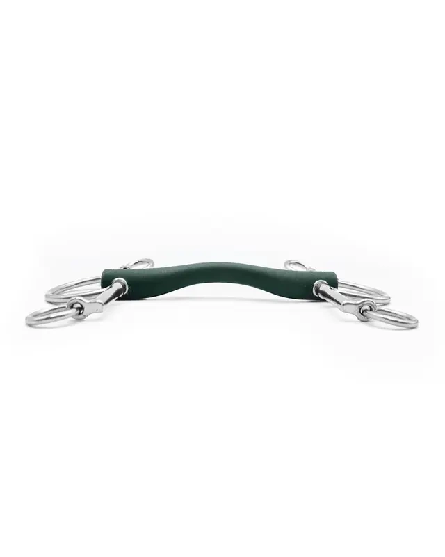 - Wędzidło wykonane z nowoczesnej, elastycznej gumy TPU. Łączy miękkość, elastyczność i trwałość, dzięki czemu doskonale sprawdza się zarówno w treningu młodych koni, jak i u wrażliwych koni, które źle reagują na tradycyjne, metalowe kiełzna.