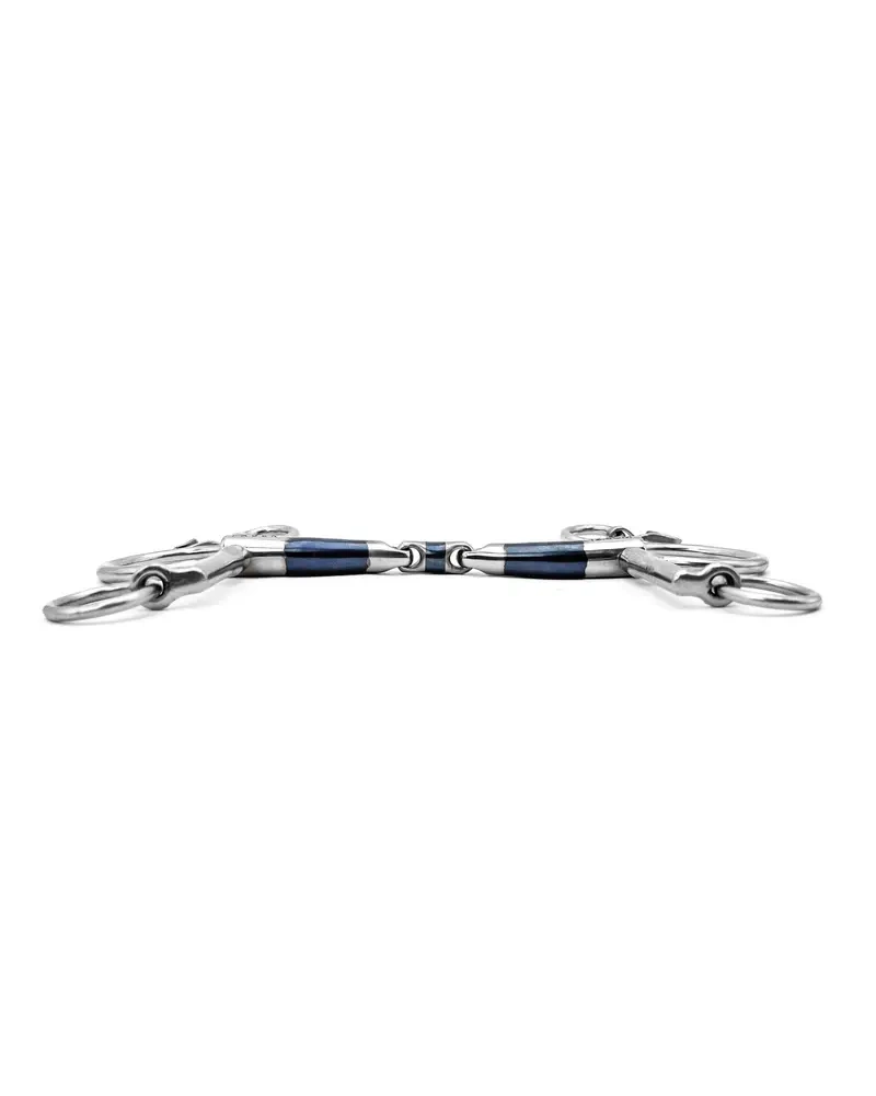 Konstrukcja opiera się na anatomicznie wyprofilowanym ścięgierzu z delikatnym wygięciem, które odciąża centralną część języka, zapewniając jednocześnie równomierny rozkład nacisku w całym pysku. To rozwiązanie pozwala uniknąć punktowego ucisku w newralgicznych miejscach – szczególnie u koni z dużym, nisko położonym językiem, które mogą czuć się przytłoczone tradycyjnym podwójnie łamanym wędzidłem.