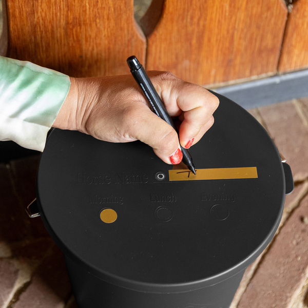 W zestawie znajdują się naklejki do opisu – można wpisać imię konia, godzinę karmienia lub szczególne zalecenia żywieniowe.