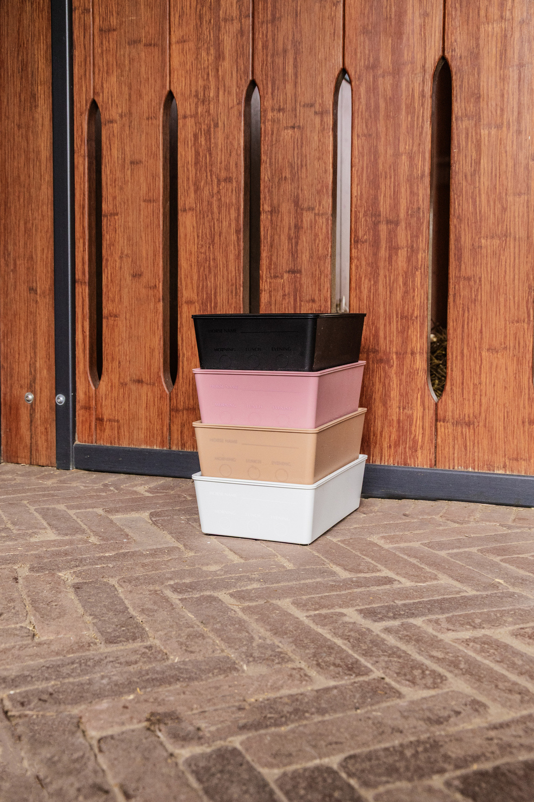 • Praktyczny, wytrzymały pojemnik na paszę, który ułatwia przechowywanie i kontrolę indywidualnych porcji żywieniowych – zarówno w stajniach pensjonatowych, jak i prywatnych.