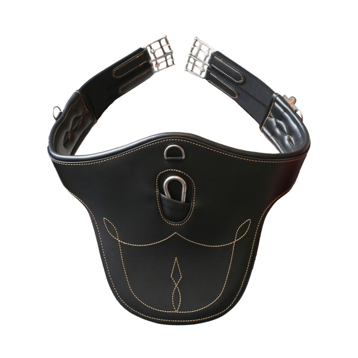 Ma gumy na obu końcach, trzy D-ringi do mocowania wodzy pomocniczych i klamrę do mocowania napierśnika do popręgu.