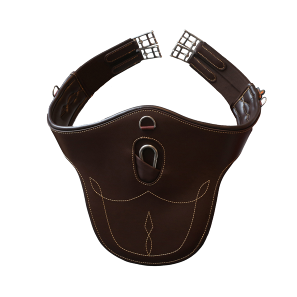Ma gumy na obu końcach, trzy D-ringi do mocowania wodzy pomocniczych i klamrę do mocowania napierśnika do popręgu.