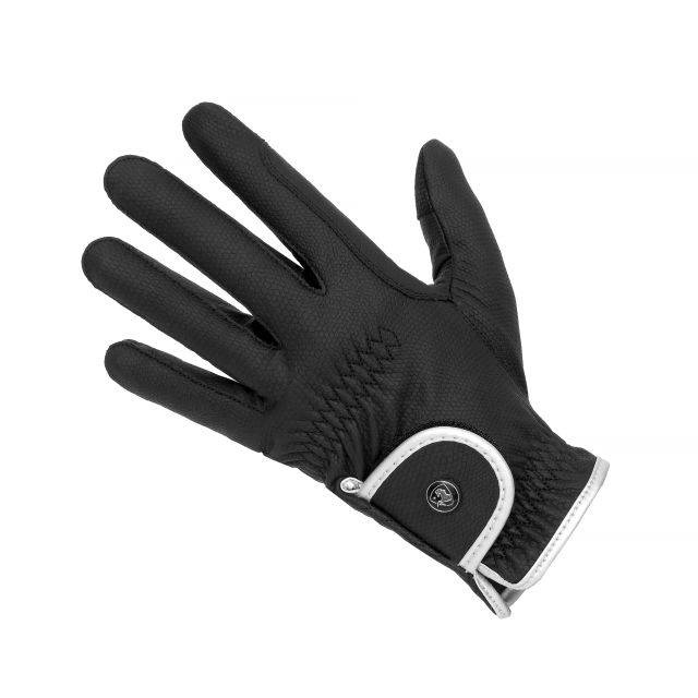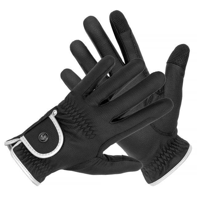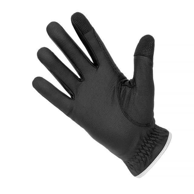 Zdobione srebrną lamówką oraz przypinką z logo. Posiadają wstawki na kciuku i palcu wskazującym aby bez przeszkód korzystać z telefonu.