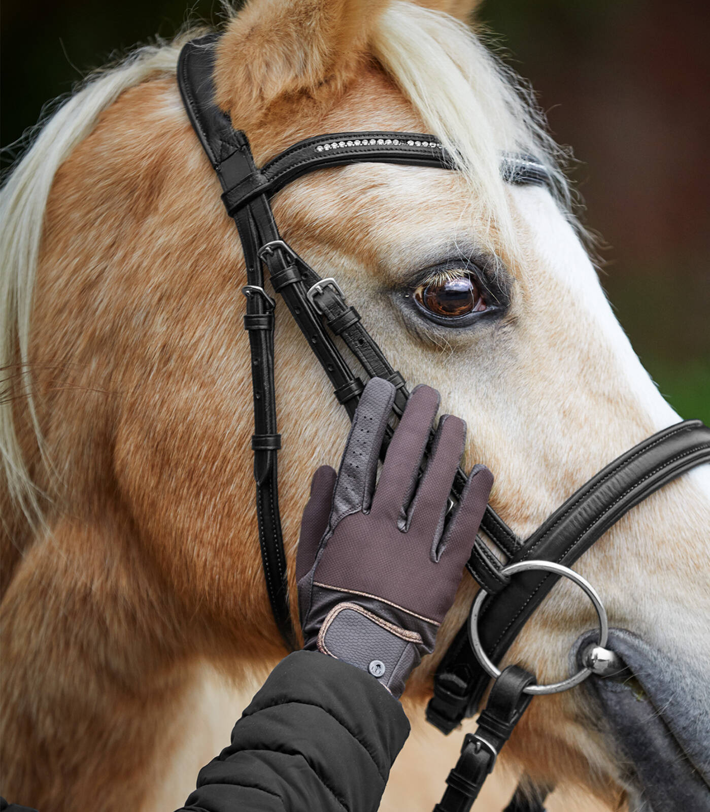 • Eleganckie rękawiczki z ozdobnym, brokatowym wykończeniem. Siatkowa wstawka na wierzchu dłoni zapewnia doskonałą cyrkulację powietrza, dzięki temu są idealne na gorące dni.
