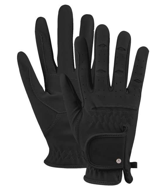 - Wytrzymałe rękawiczki jeździeckie, wykonane z materiału przypominającego zamsz.