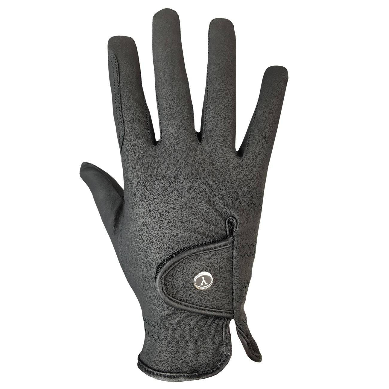 Wygodne rękawiczki jeździeckie wykonane z materiału imitującego skórę.